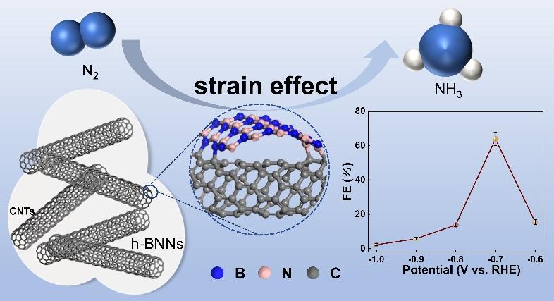 近日,美国化学会《ACS Applied Materials & Interfaces》期刊发表了题为“Boosting the Faraday Efficiency of Electrochemical Ammonia Synthesis via the Strain Effect Induced by Interfacial Hybrid Formation between BN and Carbon Nanotubes”的研究论文,该研究成果报道了应变效应对于电催化氮还原的影响。