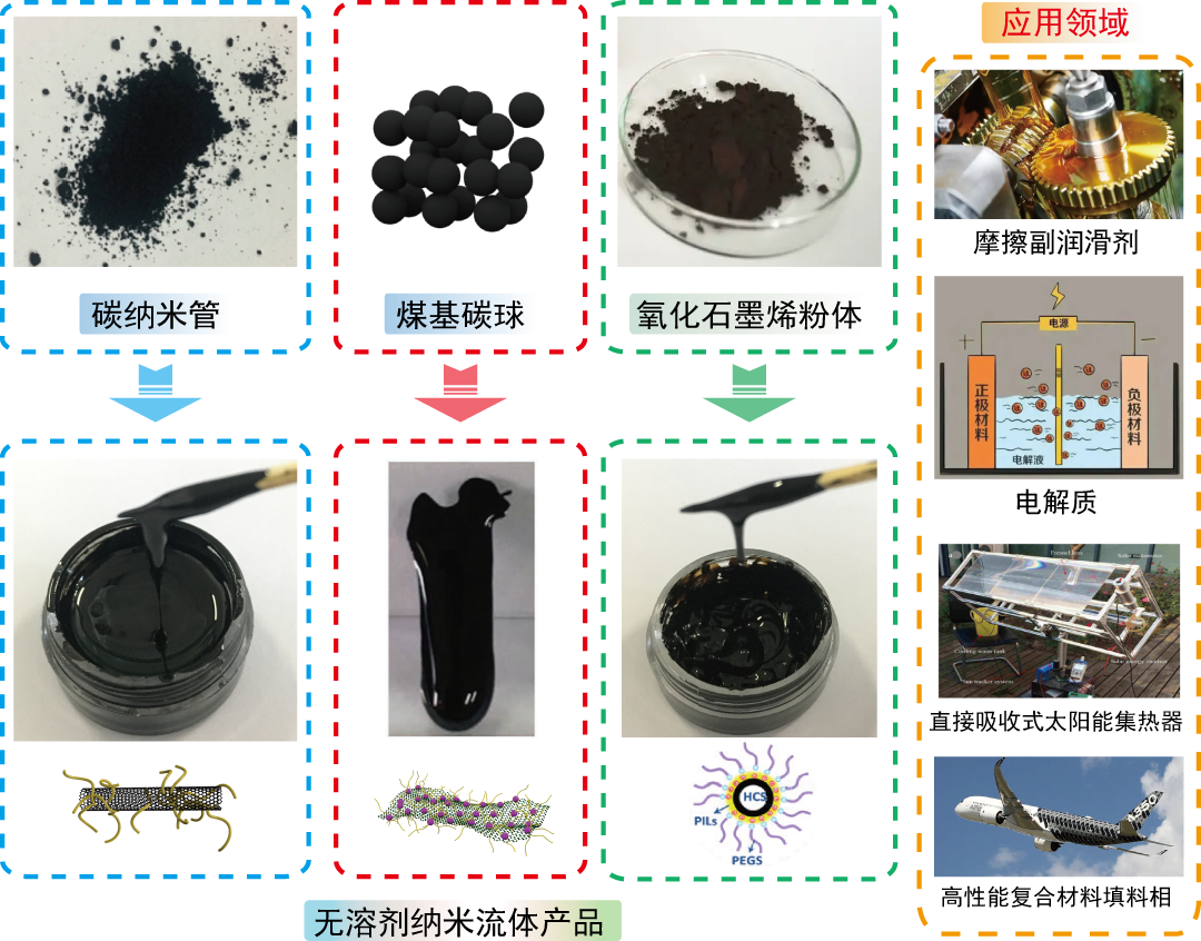 通过该技术可实现对煤基碳纳米材料(如碳纳米管、多孔碳球、煤基石墨烯、兰炭粉等)的流体化,产品在室温下呈现流动性、无挥发性,且使用的原料为工业常用试剂,容易放大生产,极大发挥煤基碳纳米材料的结构和性能优势。