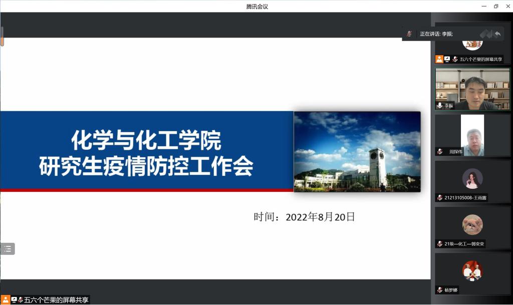 化工公司全面加强研究生疫情防控教育管理,8月20日晚,召开了研究生疫情防控线上工作会议,副经理李振、团委书记周探伟、研究生辅导员以及公司全体研究生参加了本次会议,会议由副经理李振主持。