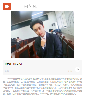 陈方琪同学分享的《红岩》讲述前辈先烈用钢铁般的意志面对困难不退缩,是一腔热血、更是一种信仰。何艺凡同学分享的《扶贫志》,从十八洞村着笔,以列传的形式讲述大湘西扶贫人充满传奇的脱贫攻坚故事,传递了脱贫攻坚的精神能量。何明辉同学分享的《把一切献给党》讲解了每位在斗争中浴血奋战的共产党员的心声。杨梦娜同学分享的《奋斗新时代》感悟奋斗之于一个国家、一个民族的非凡意义,给人以积极向上、催人奋发的正能量。