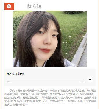 此次读书风采评比通过公众号为期一周的投票,根据票数高低评选出一等奖2名,二等奖3名,三等奖5名。此次活动到了研究生的热烈响应和积极参与,表达了对党和祖国的热爱之情和建功新时代的青春志向。
