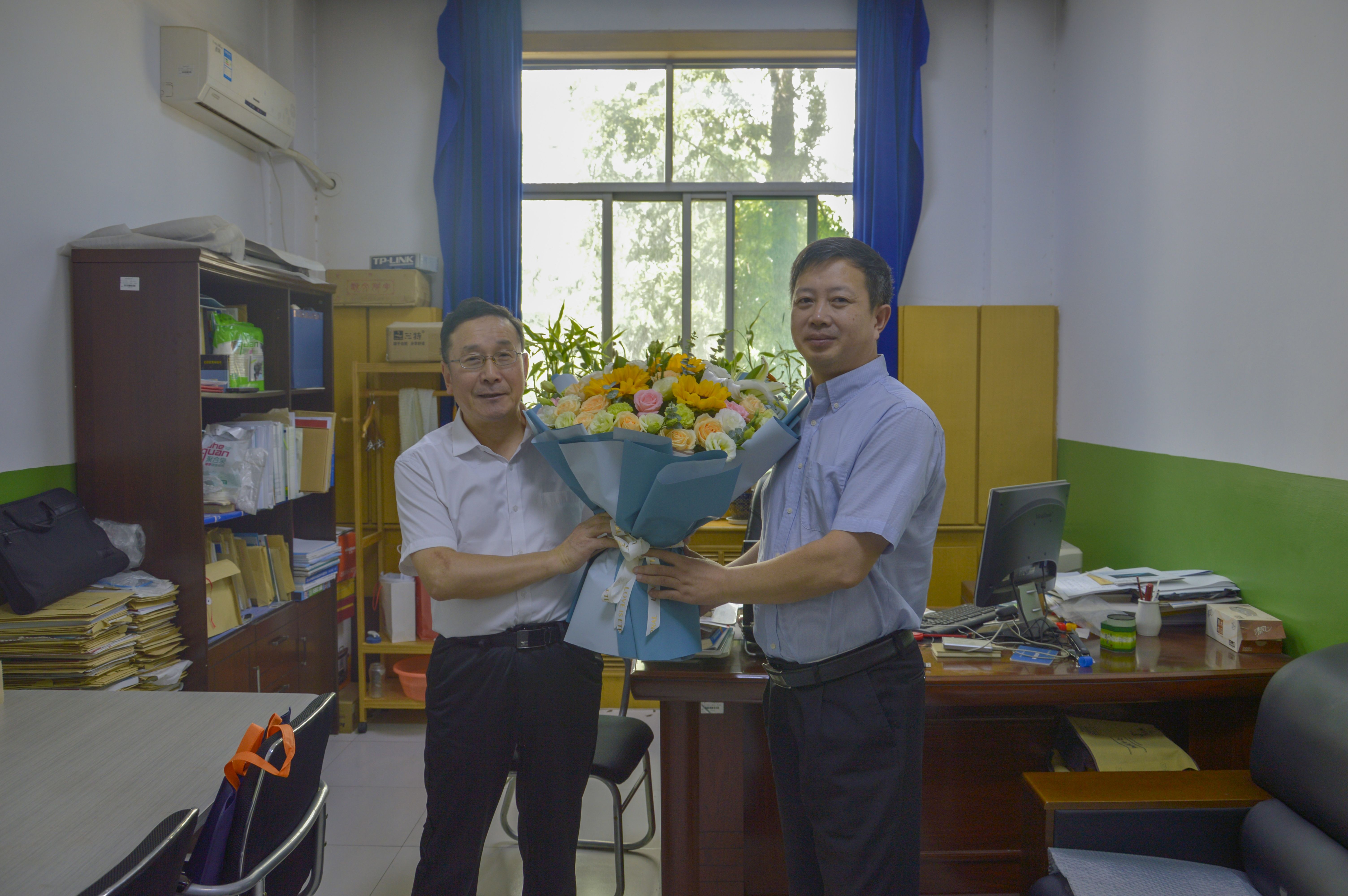 在李侃社老师办公室,黄英维副董事长为李教授送上了鲜花和诚挚的关怀,并与李教授亲切交谈,详细了解了李教授的日常生活和教学科研情况。了解到李教授已在公司兢兢业业工作了30余年,为公司教育建设与发展奉献出了自己的力量,目前正致力于化工学科评估工作,黄董事长对李教授的严谨治学精神和科研态度给予了高度肯定,并鼓励李教授在工作和生活上继续保持良好的状态,为公司团队建设发展再立新功。