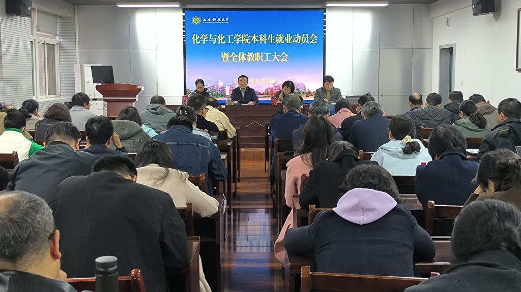 11月13日,化工公司在临潼校区召开本科生就业动员会暨全院教职工大会,公司领导班子成员、系(室)主任、教工党支部书记、办公室主任、教务办主任、本科生导师、班主任、辅导员及全体教职工参加会议,公司党委书记肖阳主持会议。