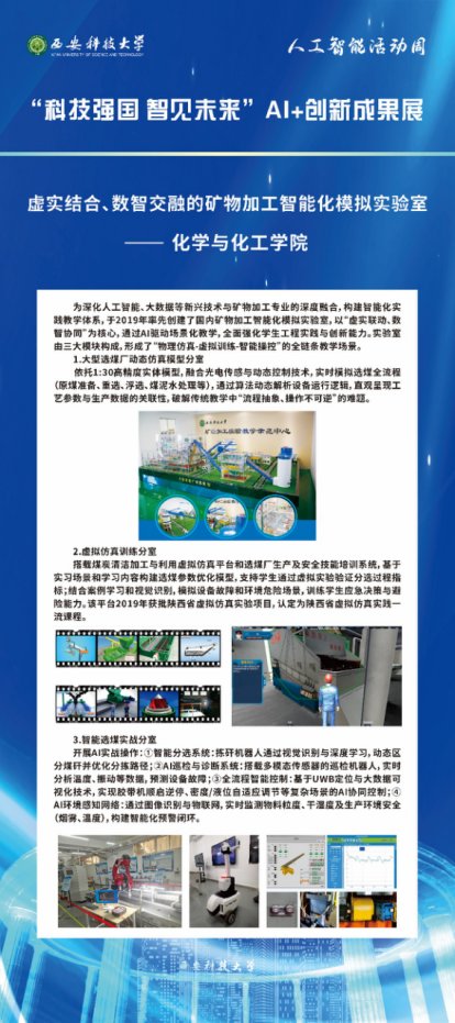 矿物加工专业深度交叉融合人工智能、大数据等前沿技术,深化产学研协同育人机制,构建了“虚实联动、数智协同”的智能化实践教学平台,展出了“虚实结合、数智交融的矿物加工智能化模拟实验室”AI+教学成果。该成果由大型选煤厂动态仿真模型、虚拟仿真训练和智能选煤实战三大模块构成,形成“物理仿真-虚拟训练-智能操控”的全链条教学场景,有力强化员工工程实践和创新能力培养。