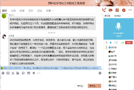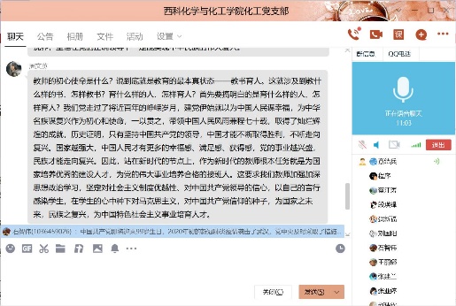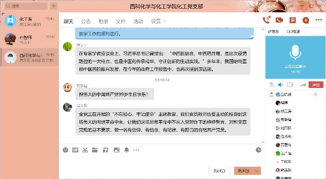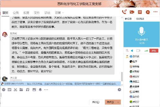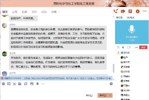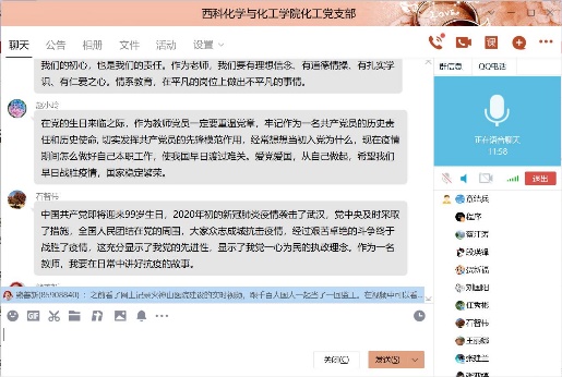 2020年6月29日19时30分,化工支部在线召开了组织生活会,支部组织生活会的主题是“迎党的生日、讲战疫故事、悟初心使命”,在这次组织生活会中,各个党员同志分享了疫情期间自己所见、所闻、所感的人和事,有很多优秀共产党员的言行感染着他们,他们将其分享给支部同志,讲述他们的感人事迹。在我们身边也有这样的故事,张亚婷同志叙述在开学后,各位教师,特别是教师党员互相交流在线教学心得,克服各种困难,修改完善授课PPT,积极投身教学工作中,保证教学质量和教学效果。毕业生返校后,化工党支部教师党员能够积极联系员工,做好员工的心理疏导,安排好毕业论文工作,保证了公司教学工作的顺利进行。章结兵同志讲述了开学后,化工系很多教工自觉行动起来,废寝忘食学习在线教学新技术,互相交流学习心得,他们秉承的目标就一个,做到线上教学不打折扣,通过努力,圆满完成这学期的教学任务,在毕业生不能到校的前提下,化工系教工尽量利用一切现代化手段与员工建立联系,及时跟踪毕业设计的进度,保证了毕业论文的质量,同时在疫情较严重的阶段,很多同志不怕疫情风险,面对面无私指导、帮助青年教工修改基金本子,提质基金撰写质量,这些身边鲜活的实例都是大家学习的榜样,是不忘初心、勇担使命的代表。在这次组织生活会中,通过这些感人事迹的分享,化工系党员同志再次感悟了初心使命,净化了心灵,提升了党员同志的理想信念,在今后的工作中,大家纷纷表态,像陈治平同志所感一样,作为一名工作在教师岗位上的党员,更应该不忘初心、牢记使命,努力做一名员工喜爱的好老师,传授知识的同时,融入思想道德教育,使员工学好知识的同时,树立正确的人生观、价值观和爱国观念。