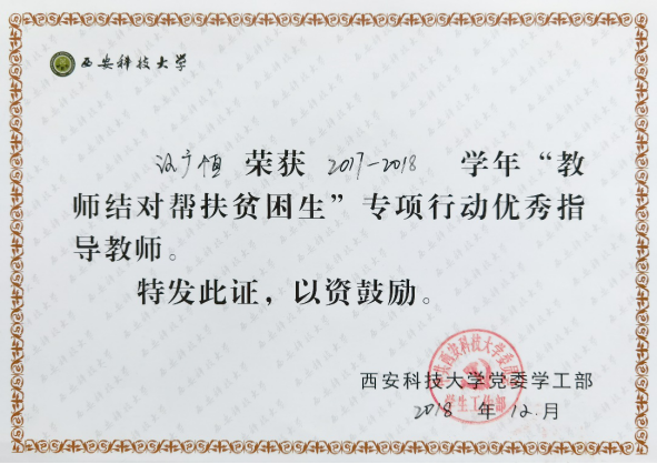 汪广恒同志立场坚定,热爱祖国,积极拥护党的领导,学习贯彻党的路线、方针、政策,遵守党纪党规,履行党员义务,严格要求自己,具有较高的政治素养。在bevictor伟德2018年度教师结对帮扶贫困员工专项行动中,该同志积极和无私地为对口贫困生学业和生活中提供力所能及的帮助,并进一步和员工建立了良好的师生关系。通过一年的努力,该员工学习成绩有了很大提高,对未来的学业和生活充满希望。基于一年来的辛勤工作,汪广恒同志被评为结对帮扶贫困员工先进个人。